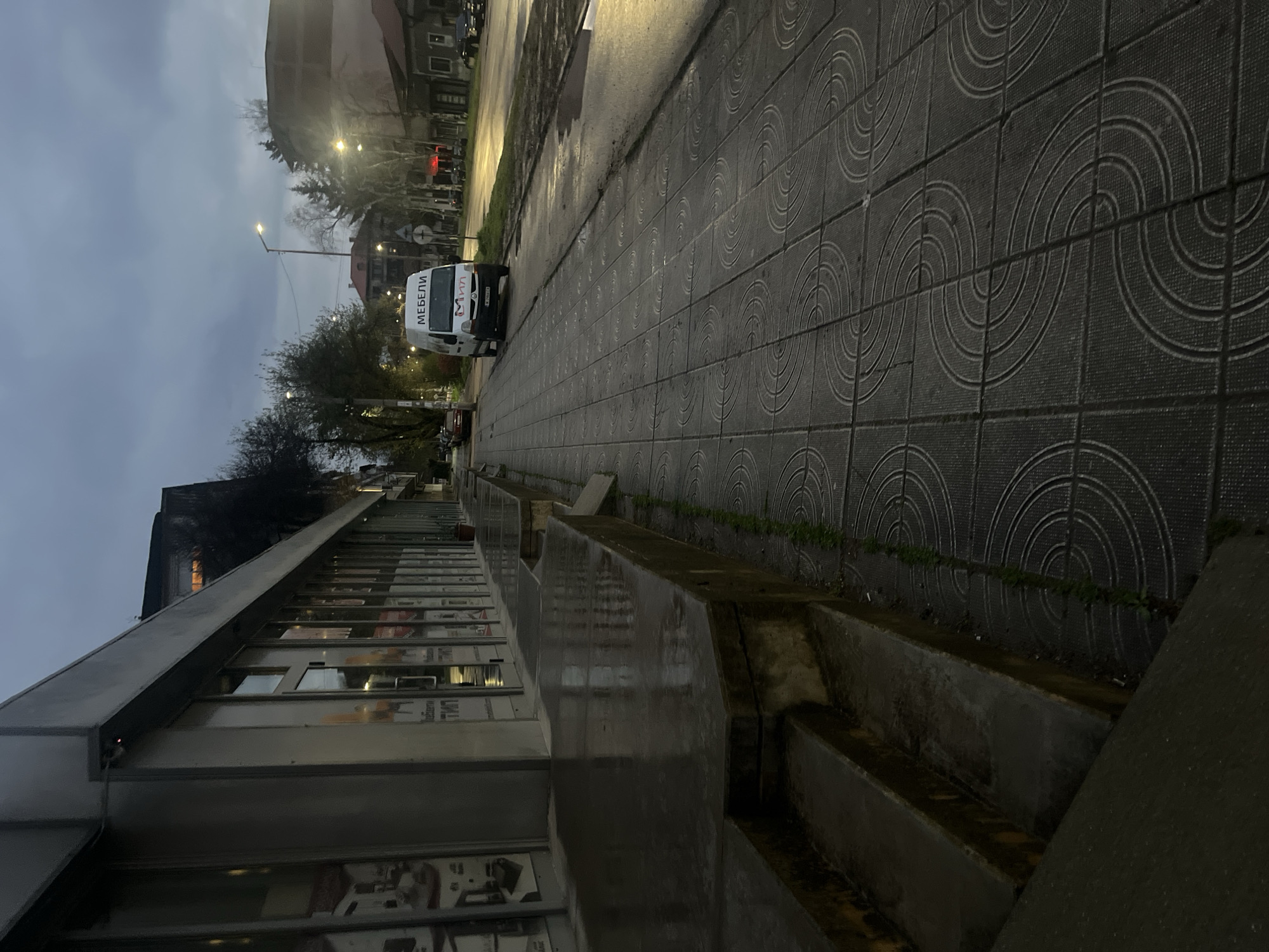 The image captures a street scene in Montana, Bulgaria. A commercial building with glass storefronts runs along the lower-left of the frame. Adjacent to the building, concrete steps ascend to a sidewalk paved with patterned tiles. A delivery van is parked on the street, and other buildings can be seen further down the road under a cloudy sky.