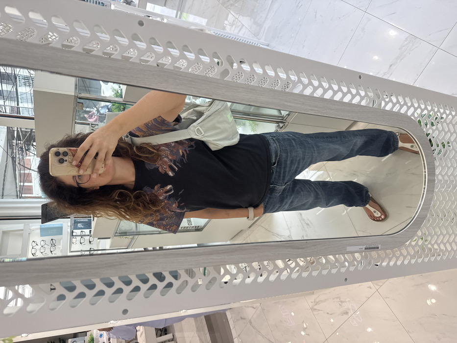 The image captures an individual taking a full-body mirror selfie inside an optical store in Nathon, Thailand