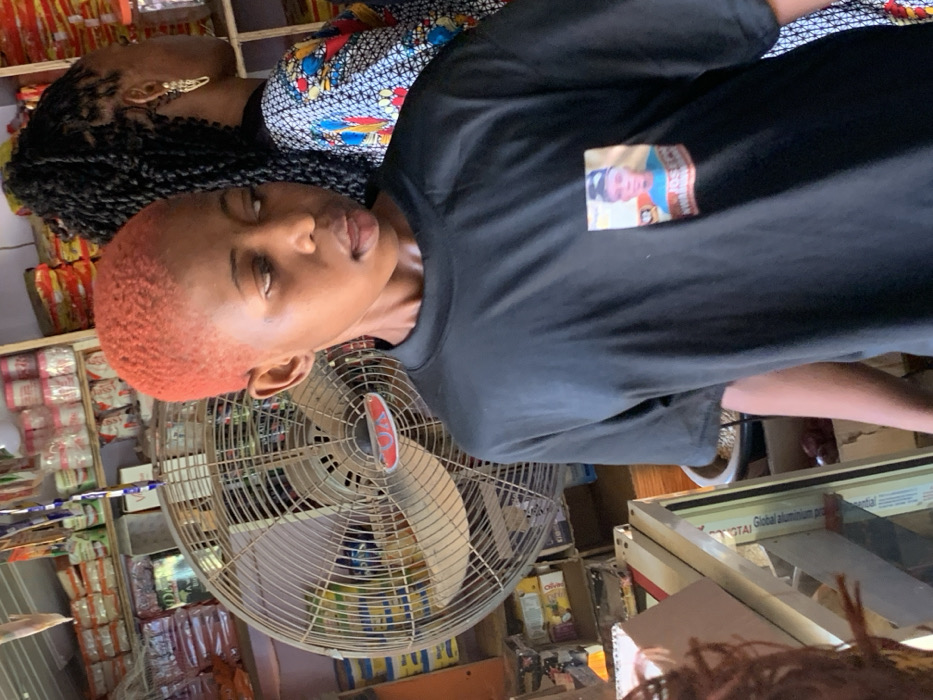 The scene depicts the interior of a general provision store in Aguleri, Nigeria. In the foreground, a young individual with short, reddish-orange dyed hair and dark skin stands, facing slightly right with their mouth slightly ajar. They are wearing a plain black, short-sleeved t-shirt that features a small, rectangular image patch on the left chest depicting a person, with the name "JOSEPH" partially visible underneath. Behind this individual, a second person is partially visible from the right, displaying braided dark hair and wearing a brightly patterned garment, along with a prominent gold-colored earring. In the background, a large, grey, industrial-style floor fan with a visible "QOX" logo is centrally positioned. Surrounding the fan and extending across the background are multiple shelves densely stocked with various packaged goods, including items in clear plastic, small containers, and boxes. In the lower-left foreground, a portion of a counter or display case with a metallic edge, showing faint "GLOBAL ALUMINUM" text, is visible. A third person's reddish-brown curly hair is minimally visible in the extreme lower-left corner.