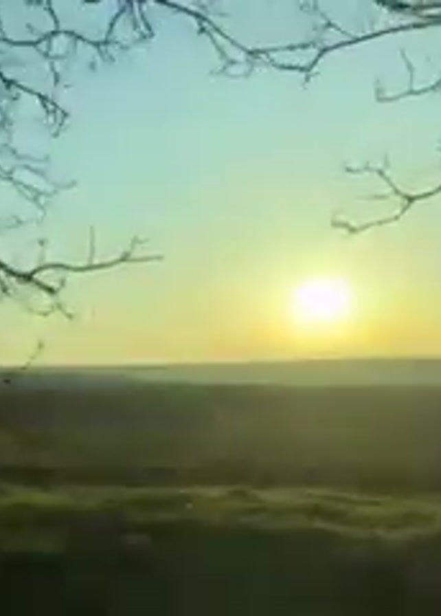 The video presents a static, low-angle shot of a landscape at sunrise or sunset. The sun is positioned in the upper center of the frame, emitting a bright glow that slightly obscures the view. The foreground consists of a field with varying shades of green. Silhouetted trees with bare branches frame the scene in the foreground, obscuring portions of the sky and field. The sky transitions from a pale blue to a yellow-orange gradient near the horizon. The light suggests a rural setting.