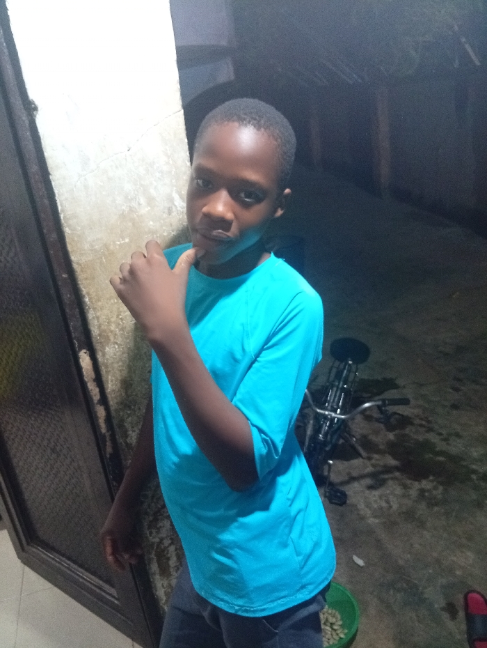 A young boy with dark skin wears a bright blue t-shirt and dark pants