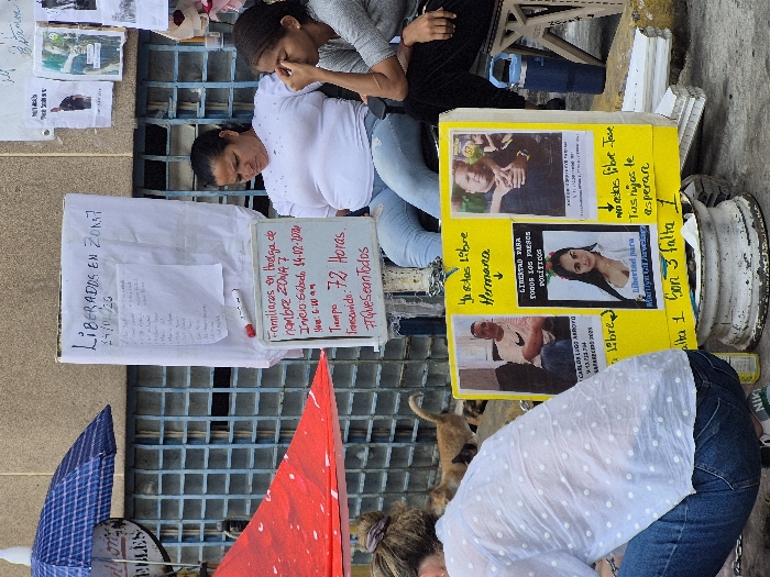 Two women sit near posters and signs related to political prisoners. One sign reads "LIBERADOS EN ZONA 7" and another notes a 72-hour hunger strike by families. A yellow poster displays photos with messages like "Libertad para todos los presos políticos" and "Tu estas libre Hermana." Another message pleads "No estés libre Jose, tus hijos te esperan." A partially obscured red flag and a blue umbrella also sit nearby.