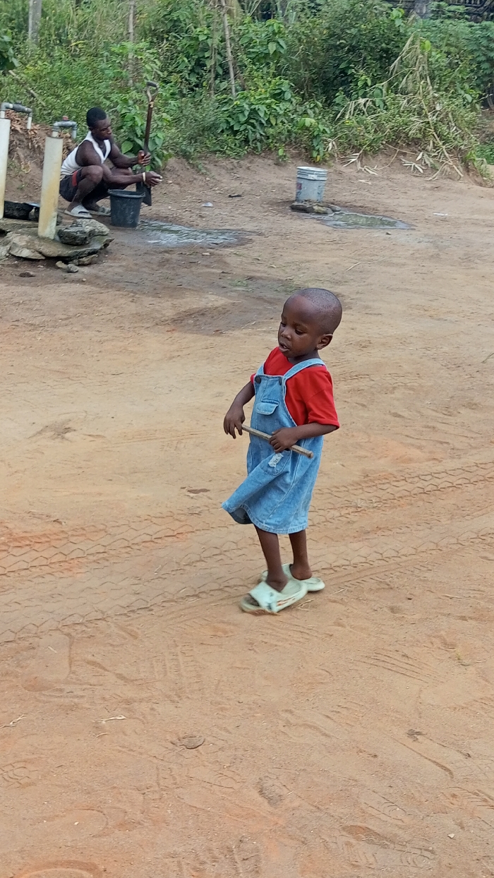 A small child wearing a red t-shirt, blue overalls, and oversized sandals stands on a dirt road holding a stick. Tire tracks mark the road surface. In the background, an adult man wearing a tank top and shorts kneels, using a shovel to work near a water source with buckets and pipes. Green foliage is visible behind the man and water area. A metal pail sits on the ground near the man. The foreground and background settings appear to be rural or undeveloped.