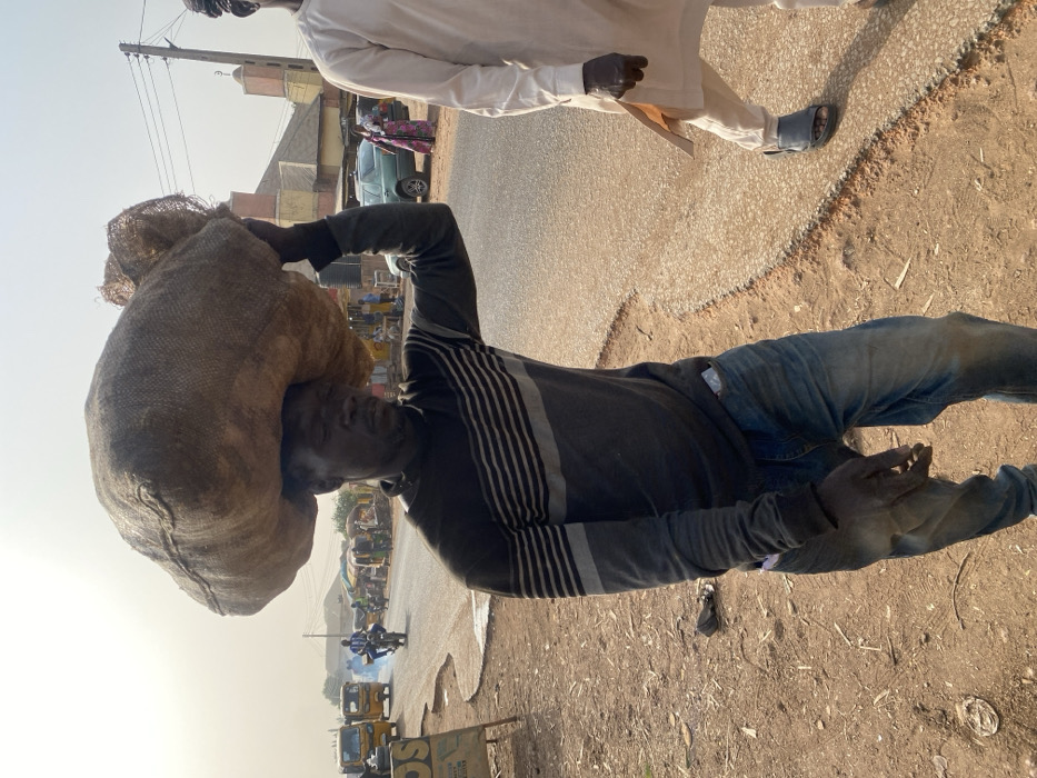 A man balances a large sack on his head, wearing a striped long-sleeved shirt and jeans. He stands on a road in a bustling area with vehicles and other people nearby. Another person in a white robe is partially visible above him. The environment appears to be a sunny, possibly dusty, outdoor market or transportation hub.