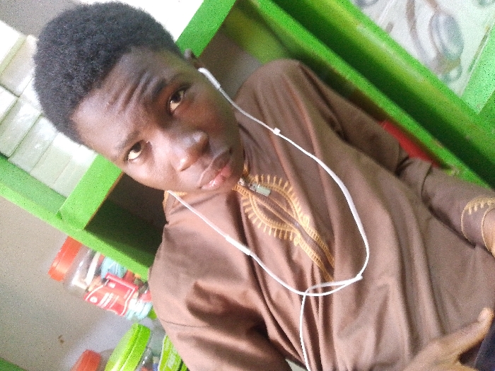 A young, dark-skinned man with short, curly hair is wearing a brown, long-sleeved shirt with gold embroidery around the neckline. White earphones are in his ears. The background is a blurred image of green shelves holding various items. The photo is taken at a slight angle, with the man looking directly at the camera. The overall image is casual and slightly grainy.
