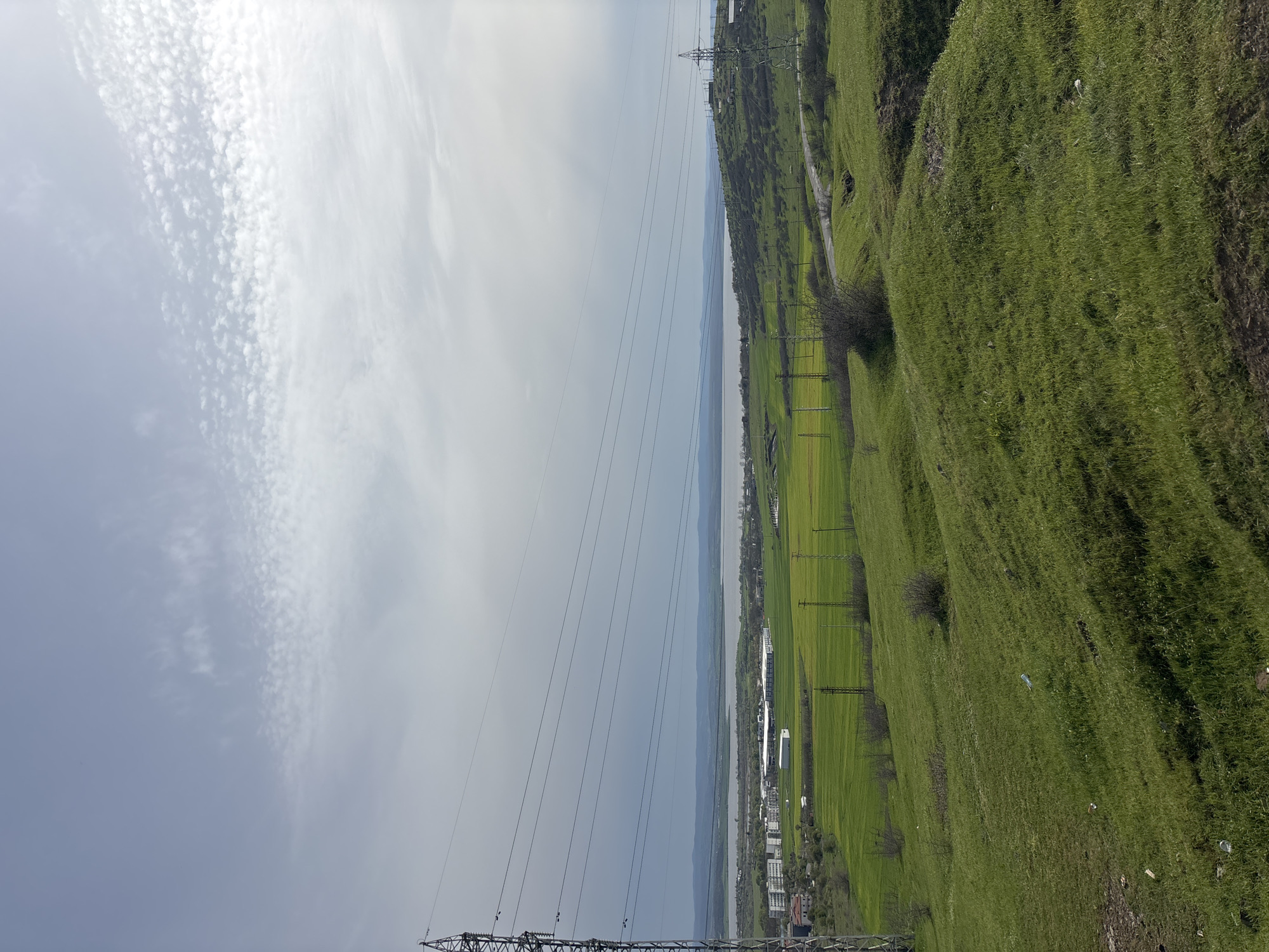 A slightly tilted, long shot depicts a verdant, grassy hillside in Burgas, Bulgaria, overlooking an expanse of water. A row of electrical towers and lines stretches across the frame, bisecting the view of the water and the opposite shoreline, where buildings are visible. The sky is overcast, with varied cloud formations. The hillside exhibits signs of scattered litter. The overall scene conveys a landscape where natural and industrial elements intersect.