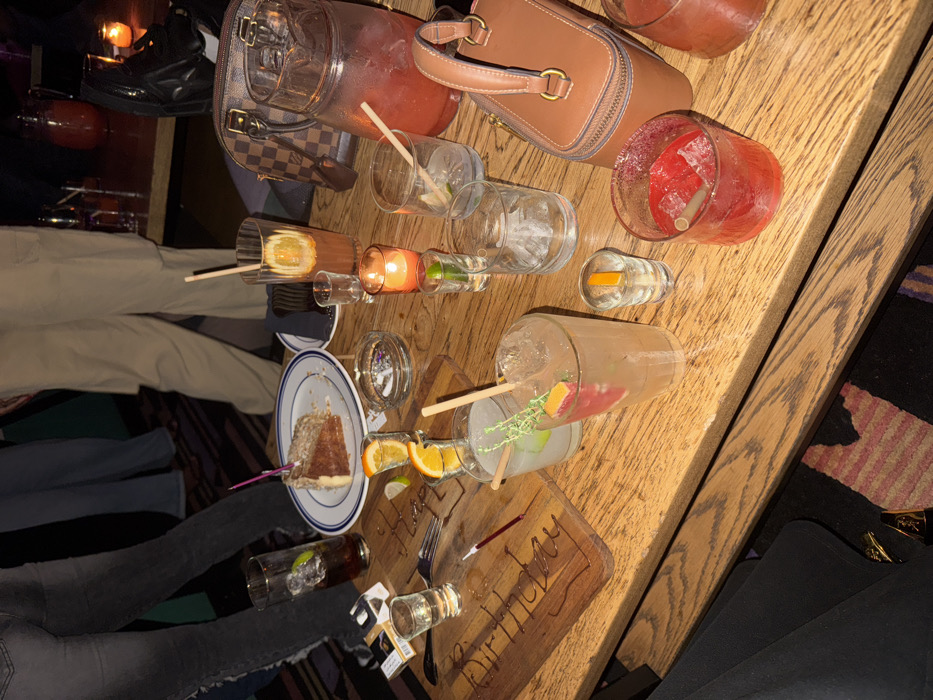 A wooden table is crowded with various drinks in glasses and a large pitcher, a partially eaten cake on a plate, and a wooden cutting board with "Happy Birthday" written on it. Also present are a brown purse, a handbag, and lit candles. People are sitting at the table, with legs visible in dark and light-colored pants.