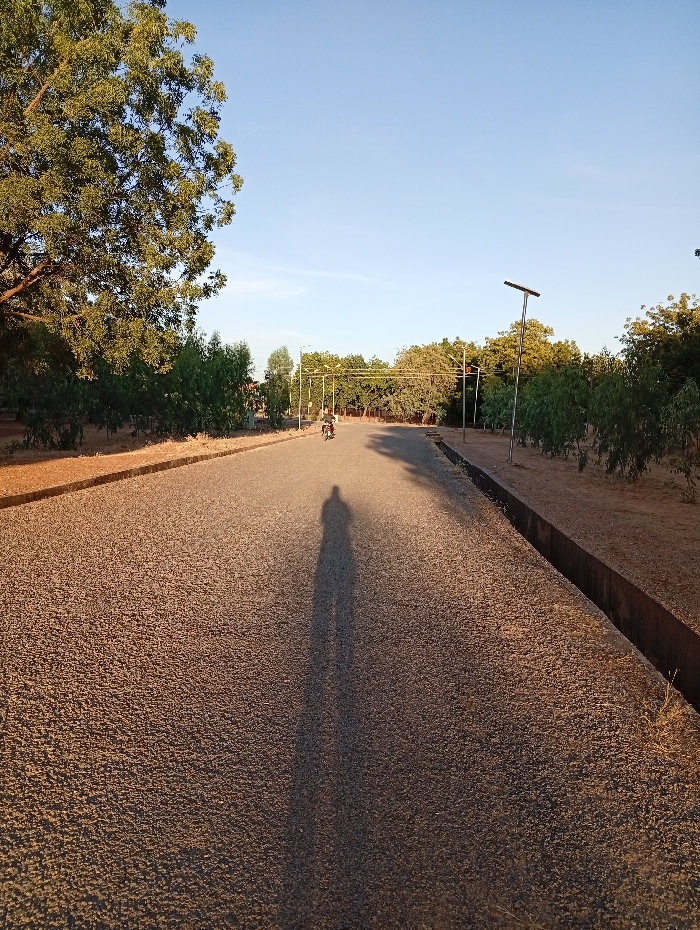 A sunlit gravel road stretches into the distance. Trees line both sides. A long shadow of a person extends onto the road. A motorcyclist is further down the road. Solar-powered street lamps appear between the trees. A shallow concrete ditch runs alongside the road on the right. The sky is clear and blue.