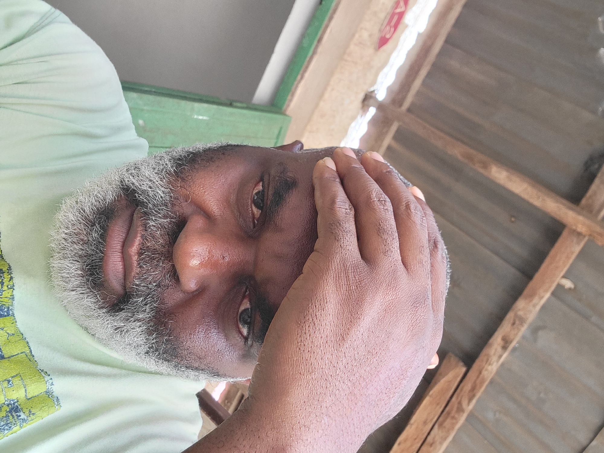 A close-up photograph depicts an adult male located in Maiburiji, Nigeria. The man has dark skin, a full, prominent beard with significant grey and black hair, and short greying hair on his head. His dark eyes, appearing somewhat bloodshot, are directed forward with an intense expression. His right hand is positioned on his forehead, fingers slightly splayed. He is wearing a light green short-sleeved t-shirt, with a partial yellow and blue/green graphic visible on the lower right. The background features a corrugated metal roof supported by rough wooden beams. To the left, a green wooden shutter or door is partially open, and a red sign with "A-2" is partially visible in the upper left.