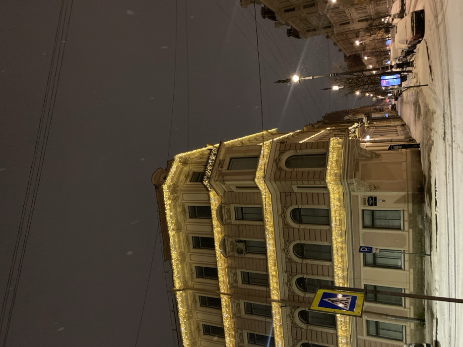 A street view at night showcases a multi-story building illuminated with strings of golden lights. Snow covers the ground. Streetlights provide additional illumination. A pedestrian crossing sign stands prominently in the foreground. The building exhibits architectural details, including arched windows and ornate embellishments. Other buildings line the street, and parked cars are visible in the distance. Snowflakes fall gently in the night sky.