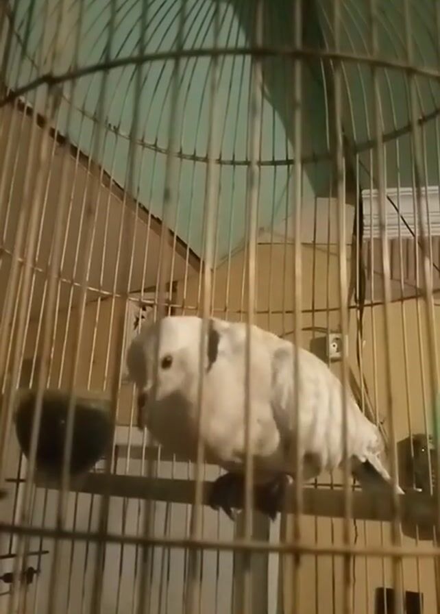 bird in a cage. The bird is white with grey markings and is hanging upside down from a perch. The cage is metal and appears to be indoors. There is an electrical outlet visible on the wall behind the cage. The camera is positioned outside the cage, looking in. The bird is making a cooing sound.