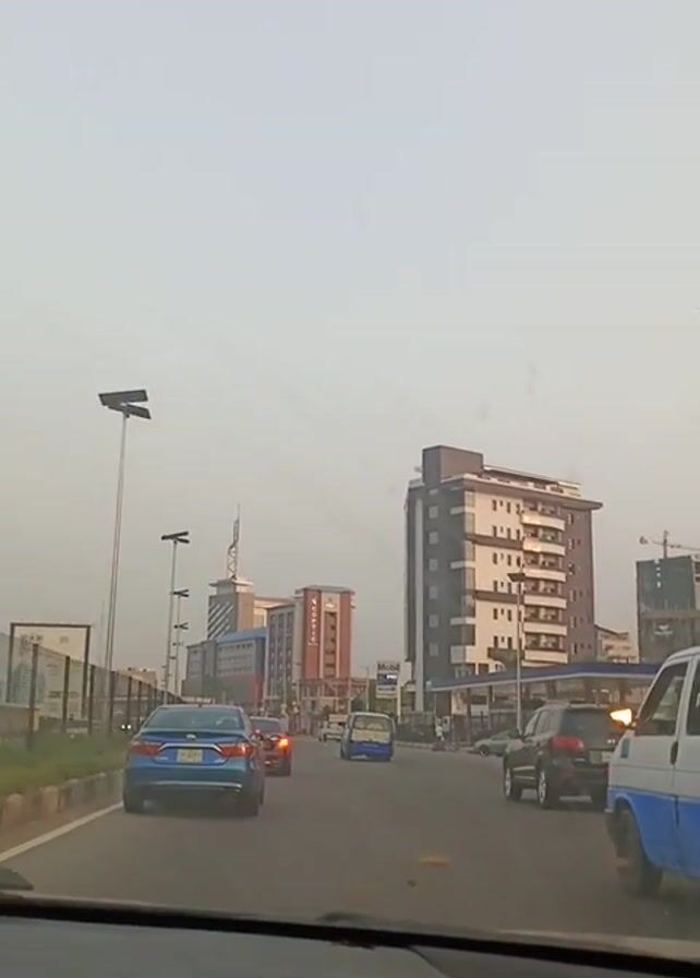 The video, taken from inside a vehicle, shows a street scene with several buildings, including a tall, modern structure and a building with red accents. Traffic is visible on the road, including a blue car in the foreground and a bus ahead. Streetlights line the road, and palm trees are visible in the background. The sky is overcast, creating a hazy atmosphere. The video is taken from a static position within the vehicle.