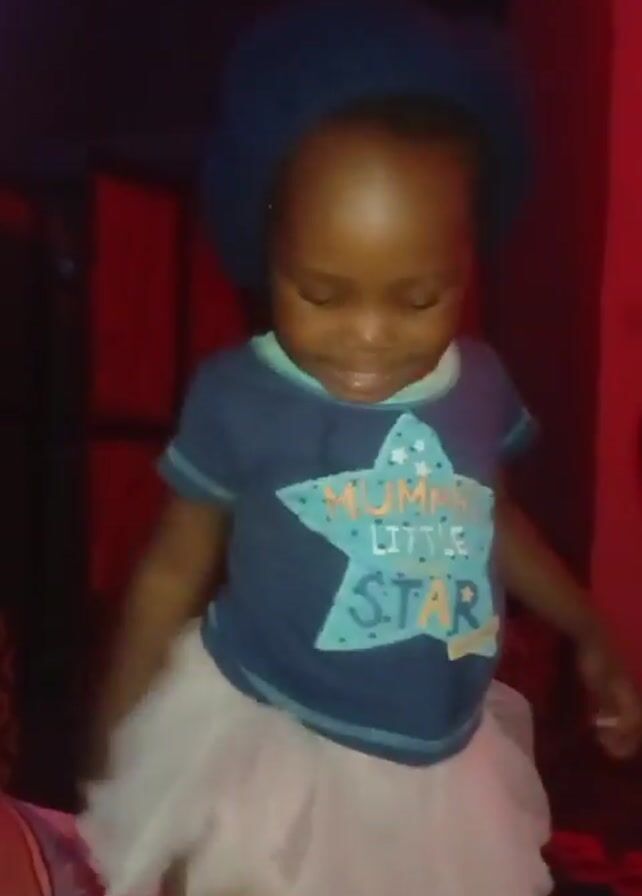 A young child is standing indoors. The child is wearing a navy-blue hat, a navy blue t-shirt with a star graphic on the front that reads "Mummy's Little Star," and a white tulle skirt. The child is smiling and appears to be dancing. The background has red lighting, making the exact details difficult to discern, but there is a dark patterned object and a partially visible doorway in the background. The video is shaky, suggesting it was taken handheld.