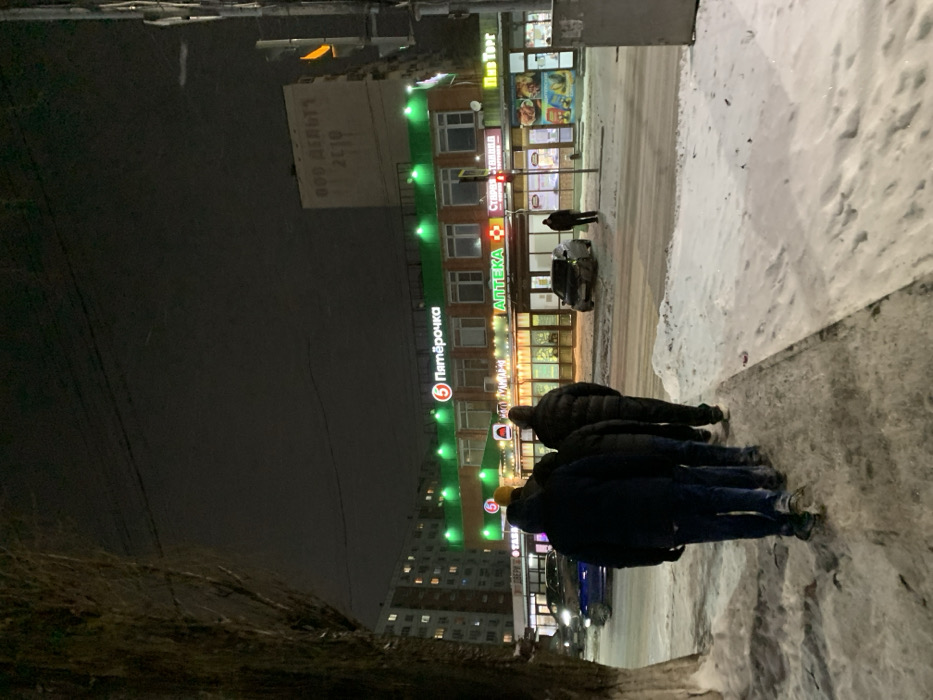 A nighttime street scene includes a line of people walking on a snowy sidewalk. A tall building with green-lit windows and signs in Russian is visible behind them, including "Пятёрочка" (Pyaterochka, a grocery store chain) and "АПТЕКА" (Pharmacy). Cars are parked along the curb. The street is illuminated by storefront signs and streetlights. The overall impression is of a cold, urban setting.