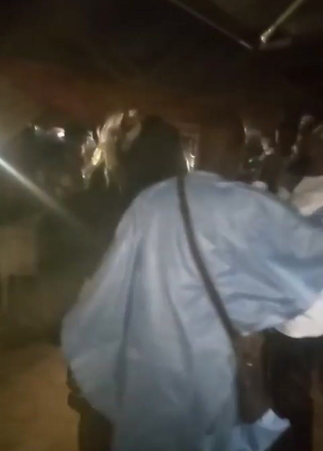 dimly lit indoor space. Several individuals are present, including a man wearing a light blue garment and a brown shoulder bag, seen from the back. Another person is visible in a red shirt and jeans. People appear to be moving around, and there is some light activity. The camera's perspective is from within the crowd. The video quality is low, and details are obscured by the darkness. The logo "TECNO SPARK" appears in the corner of the screen.