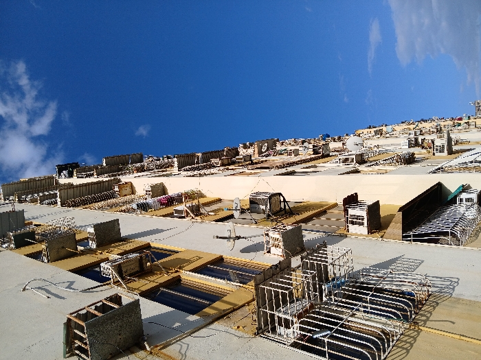 A high-angle shot reveals the rooftops of closely packed buildings under a clear blue sky with scattered clouds. The rooftops are cluttered with various structures, including satellite dishes, air conditioning units, and metal cages. Clotheslines with hanging laundry are also visible. The architectural style appears dense and somewhat chaotic. The composition suggests a warm, sunny day.
