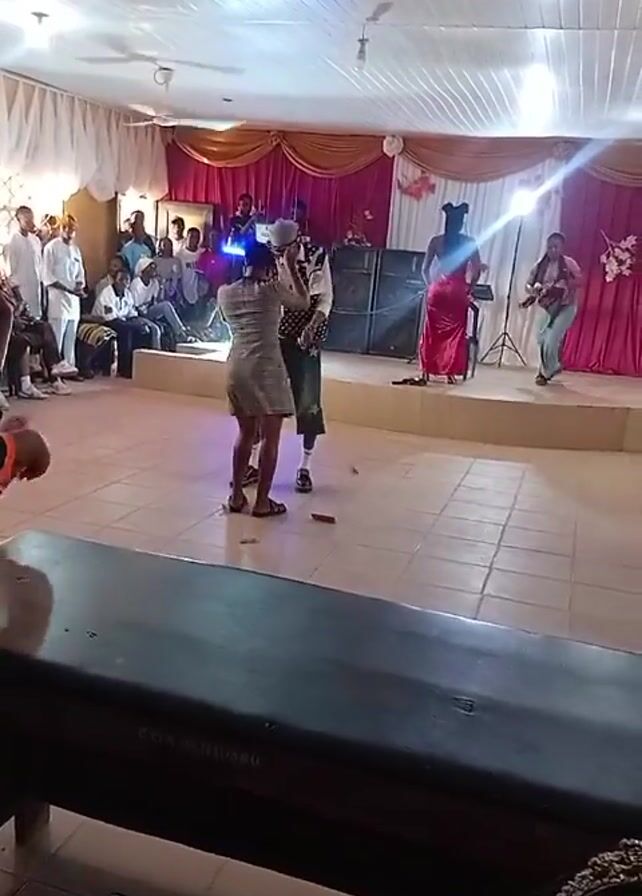 group of people gathered inside a large room for what appears to be a celebration or event. A stage is set up at one end of the room, decorated with pink and gold draping. Several people are seated in rows of chairs, watching the performers. On the stage, there are at least four people. One is singing into a microphone, and another is playing a guitar. In front of the stage, a man wearing a vintage-style outfit is dancing with a woman in a short dress. Another woman, wearing a long red garment, is also dancing. The room has a tiled floor and is well-lit with overhead lighting. Some people in the audience are holding up their phones, likely recording the performance. A long dark table sits in the foreground of the shot.