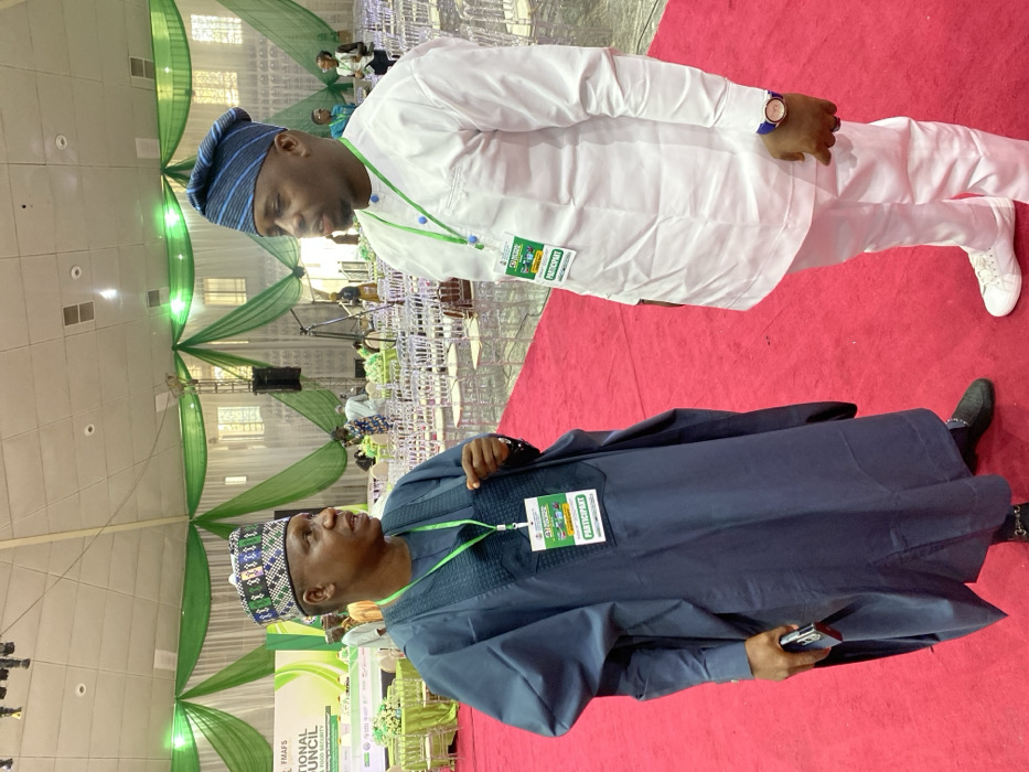 An indoor scene in Unguwar Sarki, Nigeria, depicts two adult males engaged in conversation on a red carpeted floor within a large event hall. The hall features a high ceiling with overhead lighting and is decorated with green and white drapes along the walls, indicating an event or conference. In the background, numerous clear plastic chairs are arranged in rows, with some round tables covered in green tablecloths. A stage or presentation area is visible with a screen displaying "FMAFS NATIONAL COUNCIL." The man on the left wears a dark blue traditional agbada and a multi-patterned cap. He holds a black smartphone in his right hand and wears dark slip-on shoes. A green lanyard with a white "PARTICIPANT" badge, also displaying "FMAFS NATIONAL COUNCIL," is around his neck. He is gesturing with his left hand while speaking to the man on the right. The man on the right wears a white traditional tunic and matching trousers, paired with a blue and black striped cap. He also wears a green lanyard with a "PARTICIPANT" badge, identical to the first man's. A watch with a blue strap and a rose gold-colored case is on his left wrist. He wears white athletic shoes and is oriented towards the first man, appearing to listen. Other attendees are visible in the blurred background.