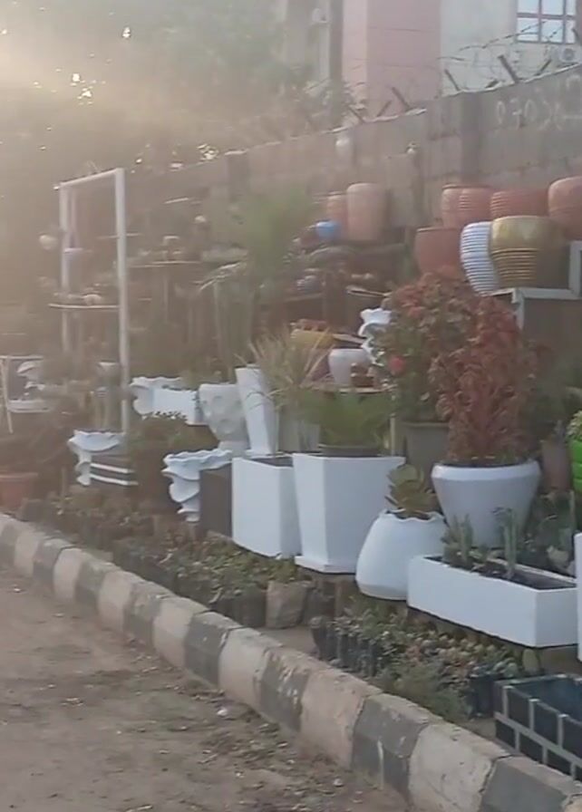 street-side plant nursery. There are numerous potted plants, arranged in rows and on shelves. Many of the pots are white, but there are also brown and orange pots. A person wearing a pink shirt is squatting down and appears to be tending to the plants. The sun is shining brightly, creating a glare. Behind the nursery, there is a building and a wall topped with barbed wire. The nursery is located next to a paved road with a curb. There is a water puddle on the road.