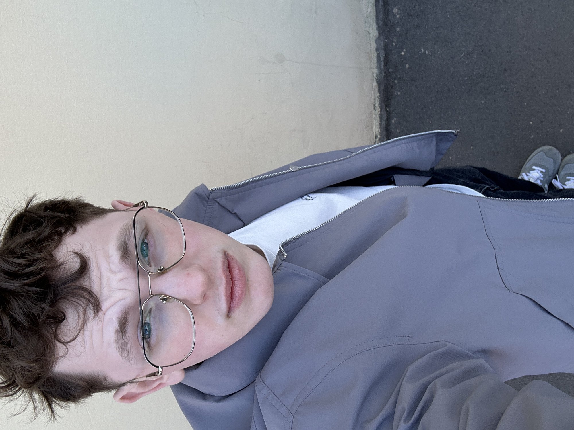 A high-angle portrait depicts a young adult, appearing male, standing outdoors. The individual has short, dark brown, curly hair, light skin, and light blue-green eyes, partially magnified by gold-rimmed aviator-style glasses. Subtle horizontal lines are visible on the forehead. The subject wears a light grey zippered jacket over a white t-shirt with a small, dark emblem on the left chest, dark trousers, and grey sneakers with white soles. The individual looks directly towards the camera with a neutral expression. The background is a plain, textured, light beige wall, and the ground beneath is dark grey asphalt, separated from the wall by a concrete curb. The scene is located in Saint Petersburg, Russia.