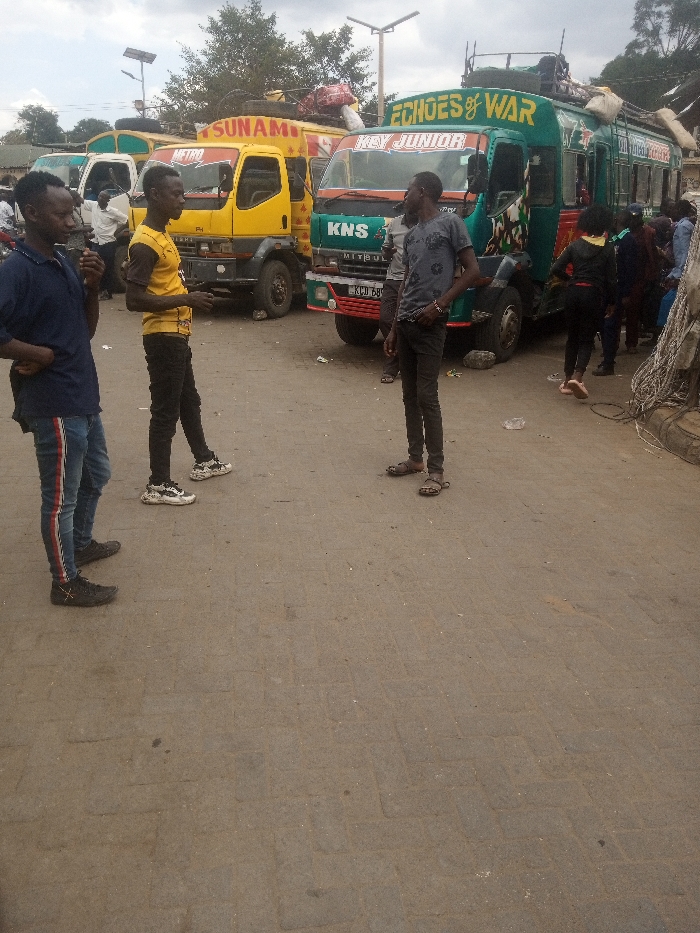 The image depicts a busy outdoor public transport area in Kitui, Kenya, characterized by parked matatus (minibuses) and multiple individuals