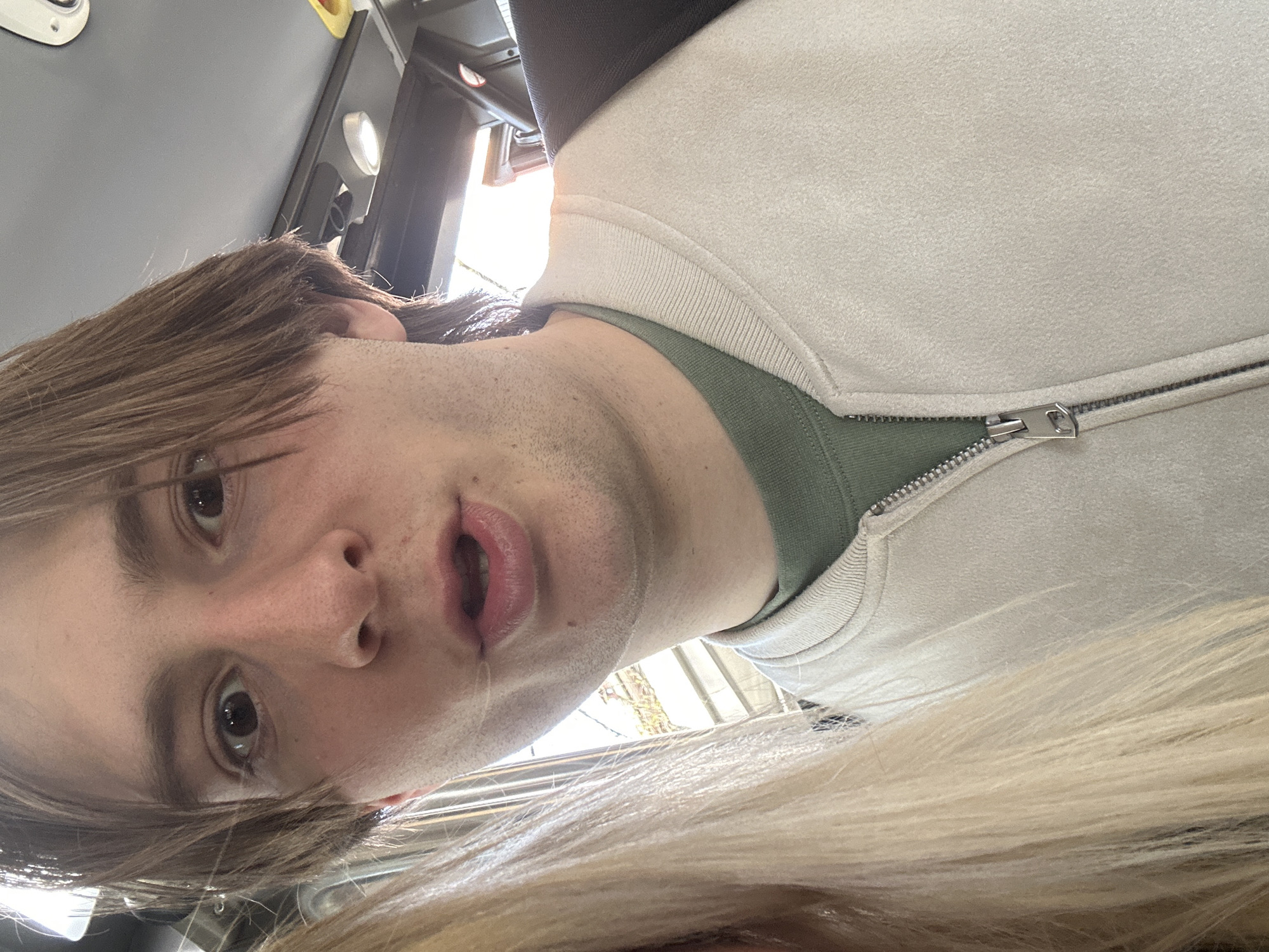 The image displays a young Caucasian male captured in a selfie within a public transport vehicle in Milan, Italy. The male subject, estimated to be 20-30 years old, has shoulder-length brown hair and light facial stubble. He is wearing a light beige zippered jacket over a dark olive green long-sleeved shirt. His expression features wide eyes looking directly at the camera, and his mouth is slightly open, revealing a portion of his lower lip and tongue. To the left, a section of long, straight blonde hair belonging to a second, mostly obscured individual is visible. The immediate background shows the interior of the vehicle, characterized by a light gray ceiling with circular recessed lighting fixtures and a dark horizontal panel above the windows. Bright, overexposed sunlight enters through the windows, obscuring specific exterior details but suggesting an urban environment. A dark seat or headrest is partially visible behind the male's right shoulder.