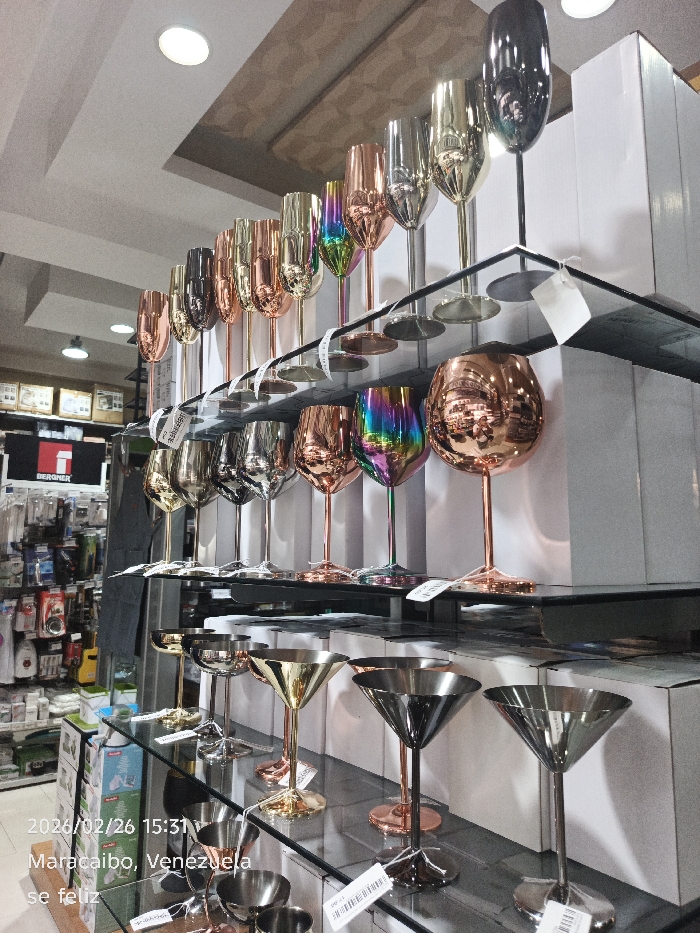 The image depicts an interior retail environment in Maracaibo, Venezuela, recorded on 2026/02/26 at 15:31. The primary focus is on multiple rows of polished metallic stemware displayed on clear glass shelves. The top shelf presents a line of champagne flutes in various finishes, including rose gold, gold, silver, black, and iridescent. Each flute features a slender stem and a circular base. The middle shelf showcases wine glasses, or similar large-bowled stemware, in rose gold, silver, and iridescent finishes, also with stems and circular bases. Behind these glasses, white retail boxes are stacked. The bottom shelf displays martini glasses with conical bowls and other smaller metallic cups, in gold, silver, and rose gold. White pricing or informational tags are affixed to the shelves and some items. In the background to the left, additional retail shelving is visible, stocked with a variety of packaged household goods and kitchenware. A black sign or screen with the white text "BERGNER" is prominently displayed. The ceiling is light-colored and features recessed circular light fixtures, illuminating the scene. A reflection of a person holding a camera or phone is discernible on the surface of one of the large rose gold wine glasses. No other individuals are present.
