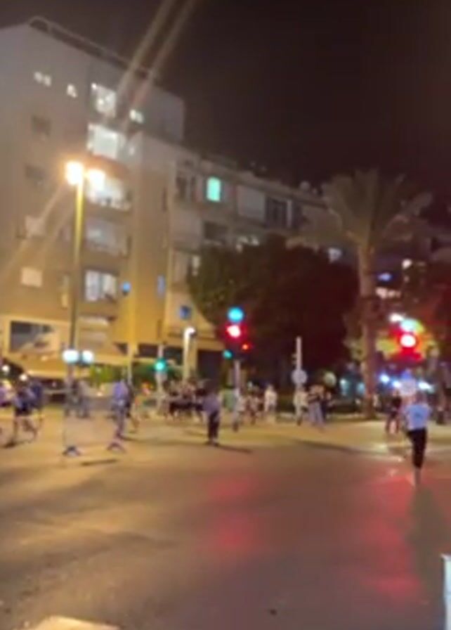 street scene at night with several people crossing the street. There are multiple buildings visible, including a tall apartment building on the left side of the frame. Streetlights illuminate the intersection, and traffic lights are visible. Some people are on scooters. The overall atmosphere appears urban and lively.