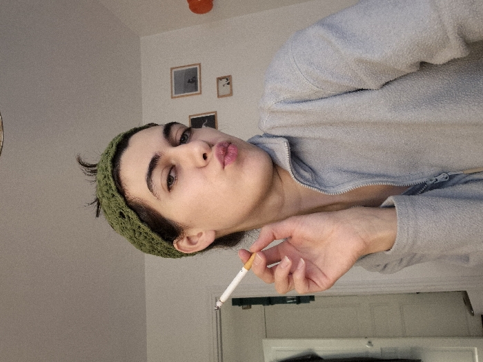 An individual is depicted in an indoor setting, identified as a room within the city of Paris, France. The subject is a female, likely a young adult, with dark hair and eyebrows, wearing a dark green crocheted headband and a light grey zip-up jacket with the zipper partially lowered. She holds a lit cigarette with an orange filter between the index and middle fingers of her right hand, from which a wisp of smoke is visible. Her lips are pursed in a "duck face" expression, and her gaze is directed towards the camera. The background consists of light-colored walls. To the left, a white door and its frame are partially visible. On the wall behind the subject, three framed pictures of various sizes are present. A portion of an orange spherical object is visible on the far right side of the frame. The ceiling, also light-colored, is visible at the top.