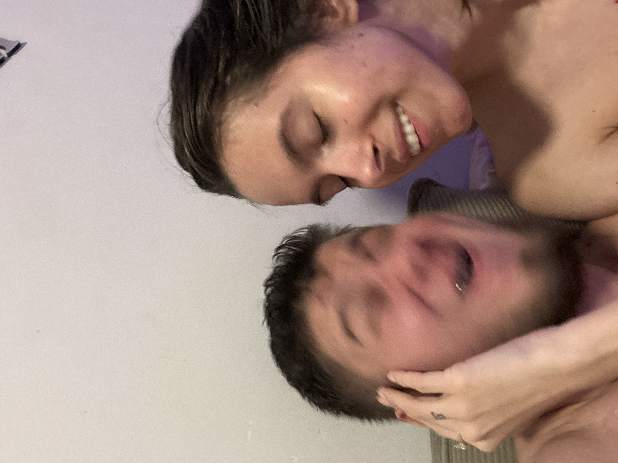 Two individuals, an adult male and an adult female, are captured in a close-up indoor photograph within a residence in Corby, United Kingdom. The background consists of a plain, light-colored wall, with a striped textile object partially visible behind the male's left shoulder. The female, positioned on the right, has dark hair, which appears damp, and is smiling with her eyes closed. Her bare right shoulder and upper chest are visible, illuminated by a faint purple light from the right. The male, on the left, has short dark hair and facial stubble. His face is motion-blurred, suggesting movement, with his mouth open and a lip piercing visible. A hand, presumed to be the female's, is placed on the side of the male's head; a small black tattoo is present on her index finger, and a ring on her ring finger. Both subjects appear to be shirtless or in minimal attire.