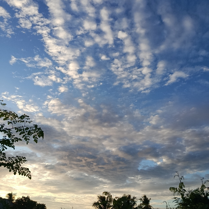 A partly cloudy sky displays a mix of stratocumulus and altocumulus clouds. Higher up, altocumulus clouds form a pattern, while lower stratocumulus clouds create a textured, gray backdrop. Silhouetted trees and foliage fill the lower portion of the frame, hinting at a sunrise or sunset. The clouds closest to the horizon exhibit a soft, golden glow.