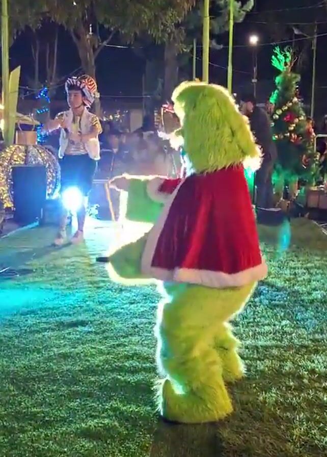 Grinch character and a person dressed as an elf performing on a makeshift stage in front of a crowd