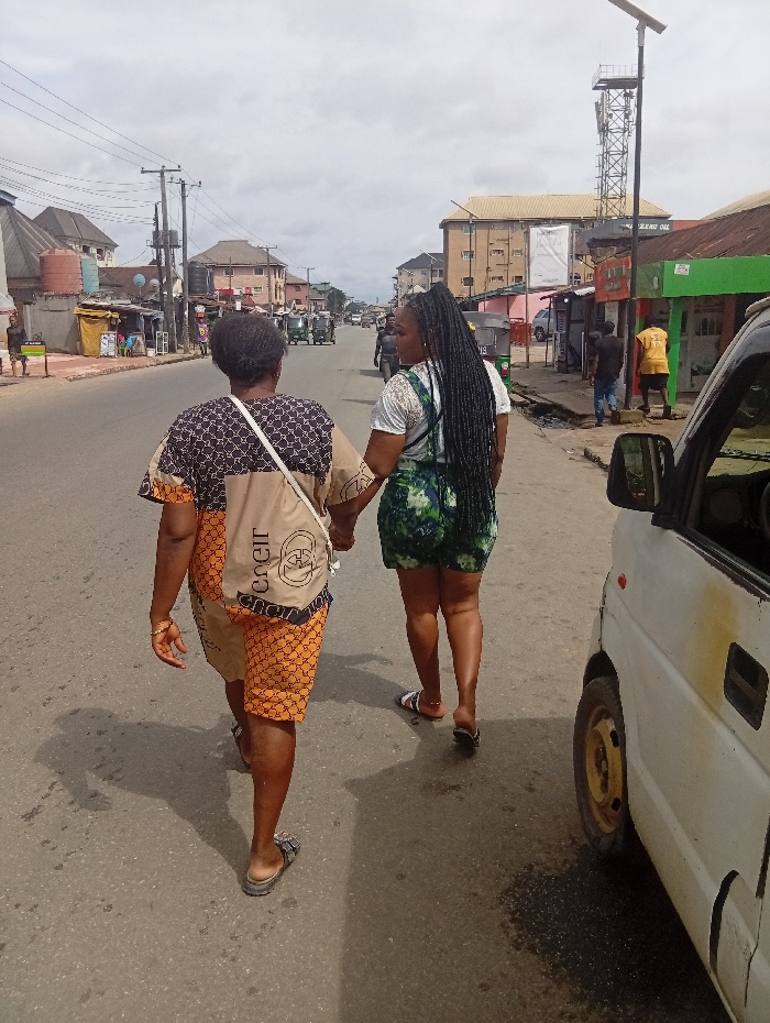 The image depicts a street scene in Umuode, Nigeria, viewed from slightly behind two women walking away from the camera. The street is a paved, two-lane asphalt road with visible wear. In the foreground, two women walk side-by-side, holding hands. The woman on the left, an adult with dark skin, wears a short-sleeved top with a dark and light patterned upper section and orange patterned shorts. She carries a light-colored canvas-like bag over her right shoulder, featuring dark text and a circular logo. She wears dark sandals. The woman on the right, also an adult with dark skin and long dark braided hair, wears a light-colored short-sleeved top and dark green floral patterned shorts. She looks slightly to her right, away from the camera. She wears light-colored sandals. Both women cast shadows on the road to their left. To the immediate right of the frame, a portion of a white vehicle, possibly a van or small truck, is visible, showing part of its front passenger door, a yellow-painted wheel, and a side mirror. The vehicle appears worn, with rust-colored stains below the window line. The background shows a busy urban environment. On the left side of the street, multiple buildings of varying heights and conditions line the road. Some feature corrugated metal roofs, while others are multi-story structures with flat roofs. Utility poles with numerous overhead wires are prominent. Several three-wheeled auto-rickshaws (keke napep) are visible further down the street. Small shops or stalls with colorful signage are also present. On the right side of the street, similar commercial buildings are observed, including one with a green facade. A tall, open-frame metal structure, possibly a telecommunication mast or a water tower, stands next to a lamppost equipped with a solar panel. Several individuals are visible in the background, walking or standing near the establishments. The sky is overcast with a light grey cloud cover.