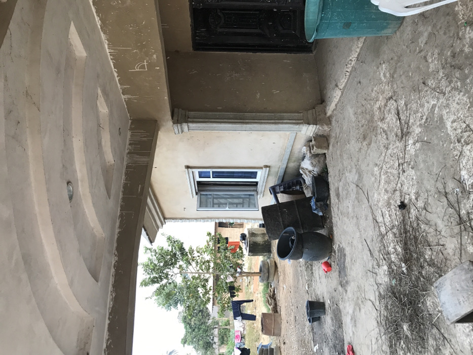 The image depicts a building exterior with a cream-colored facade. A decorative arched ceiling overhangs, featuring recessed circular elements. A window with a blue frame is visible below. Various items are scattered on the ground, including plastic bins, pots, wood, and what appear to be discarded plant debris. Laundry is hanging on a clothesline in the background with trees around it.