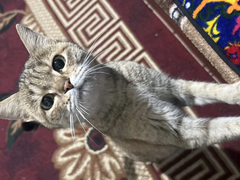 A curious, tan tabby cat gazes upward with wide, green eyes. Its head is tilted, presenting a charming, inquisitive expression. Long, white whiskers extend from its muzzle. The cat lies on a red rug with a geometric pattern. To the upper right, a portion of an ornate, embroidered cloth is visible, displaying vibrant colors. The cat's fur appears soft and well-groomed.