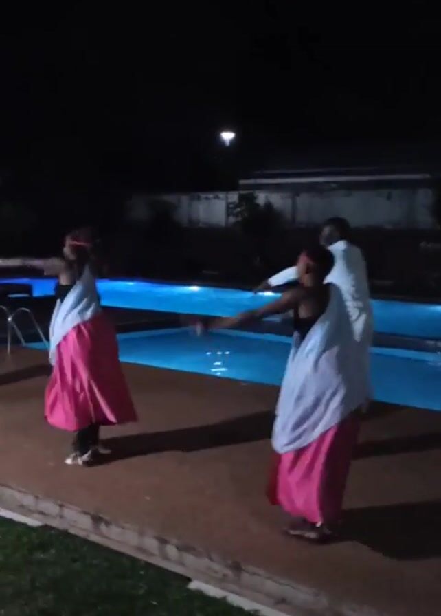 In a nighttime video, four people dance beside an illuminated swimming pool. Three individuals wear pink skirts and white tops, while the fourth wears a white outfit. They are dancing on a concrete patio with grass visible at the edge. The background includes a building and streetlights. The pool emits a bright blue glow against the darkness.