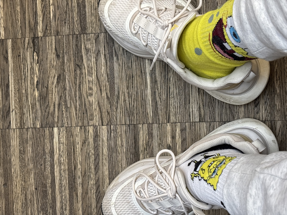 The image displays a first-person, downward-facing perspective of two feet wearing sneakers and socks, positioned on a dark brown wooden plank floor
