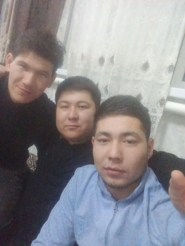 Three young men are huddled together in a close-up shot. The man in the foreground wears a light blue zippered jacket. Behind him to the left, a man with dark hair sports a black shirt. Another man stands behind and between them, also in a black top. The background is indistinct, showing patterned curtains and a portion of a white wall or fixture. The picture appears to be taken indoors, possibly a casual snapshot.