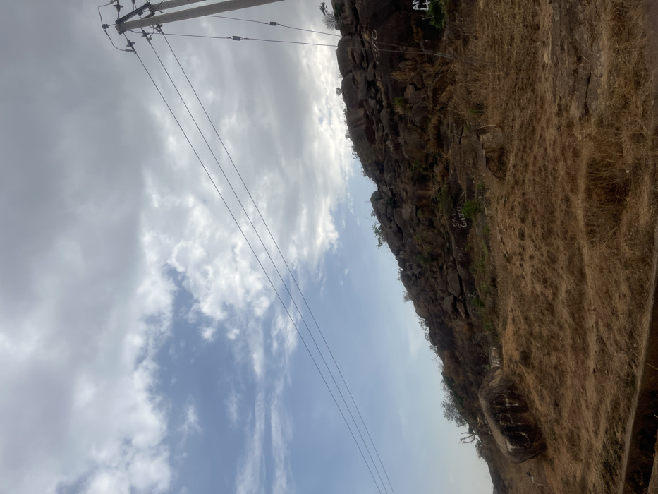 A landscape with a rocky, grassy hillside sloping upwards on the right. Power lines run diagonally across a sky filled with scattered clouds. Some markings are visible on the rocks of the hillside. The overall lighting suggests a bright, sunny day. The scene merges nature and human infrastructure.