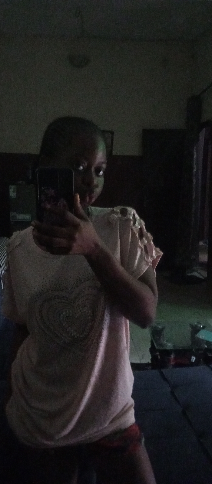 A person holds a phone up to take a selfie in a dim room. The person is wearing a light pink shirt with a heart design. There is a dark doorway in the background, and another dark object beside it. The floor is covered with dark tiles. The lighting is poor, making details difficult to discern.