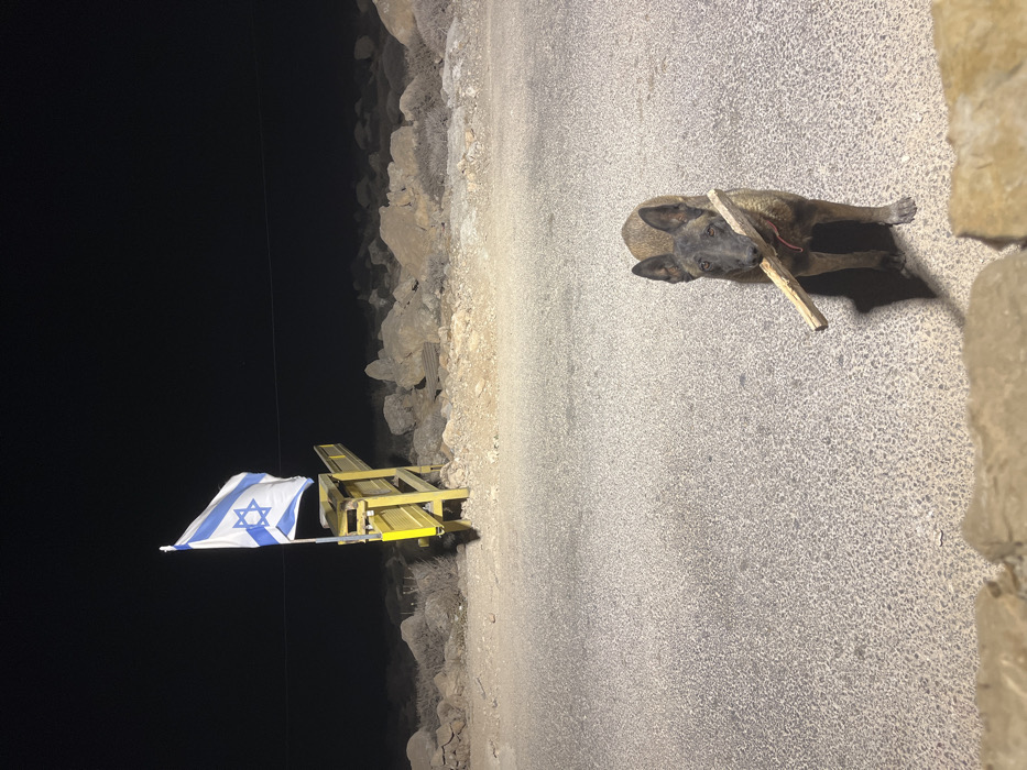 A nighttime outdoor scene in Unknown, Palestinian Territory, illuminated by artificial light. A short-haired, tan and black-muzzled dog stands on a gray paved surface in the lower center, facing forward, holding a light-colored wooden stick horizontally in its mouth. The dog casts a shadow to its right. In the upper left, an Israeli flag, featuring a blue Star of David and two blue stripes on a white field, is unfurled and attached to a yellow, multi-sectioned barrier or stand. The area beyond the paved surface and behind the yellow structure is characterized by scattered light-colored rocks and sparse dark vegetation, set against a dark night sky.