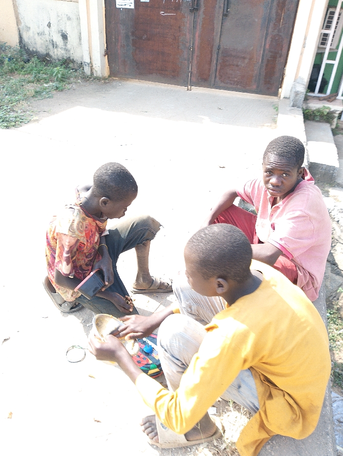 The image depicts three young males seated on the ground in an outdoor environment in Kubwa, Nigeria