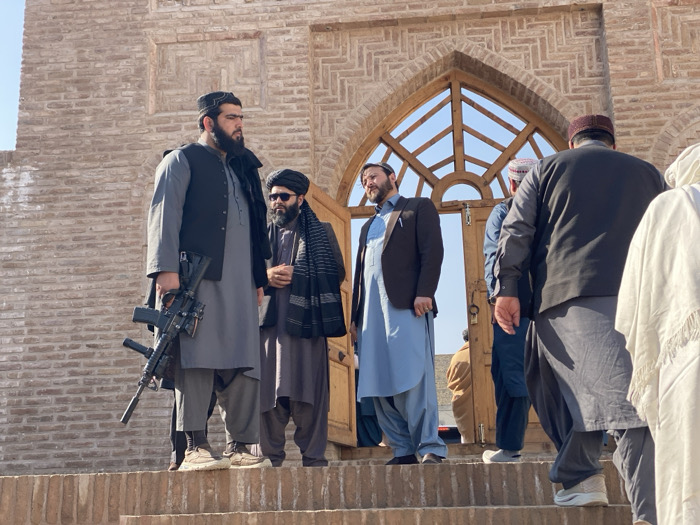 The image captures a group of men gathered on the brick steps leading to the arched entrance of the Shrine of the Cloak (Kherqa Sharif Shrine) in Kandahar, Afghanistan. The building's facade consists of patterned light brown brickwork surrounding a wooden double door with an arched transom window above, through which a clear blue sky is visible. In the foreground, on the left, a tall, bearded man stands wearing a grey shalwar kameez, a dark waistcoat, and a dark head covering. He holds a black assault rifle in his right hand, pointed towards the ground, equipped with an optic, a foregrip, and a muzzle device. Immediately to his right and slightly behind him, another bearded man in a dark shalwar kameez and a black and white patterned scarf wears sunglasses. Further right, a bearded man in a dark suit jacket over a light blue shalwar kameez looks towards the left. On the far right, partially visible from behind, are two individuals: one wearing a dark shalwar kameez and a maroon cap, and another in a light-colored, possibly white, garment. Several other figures are visible through the doorway and on the steps in the background.