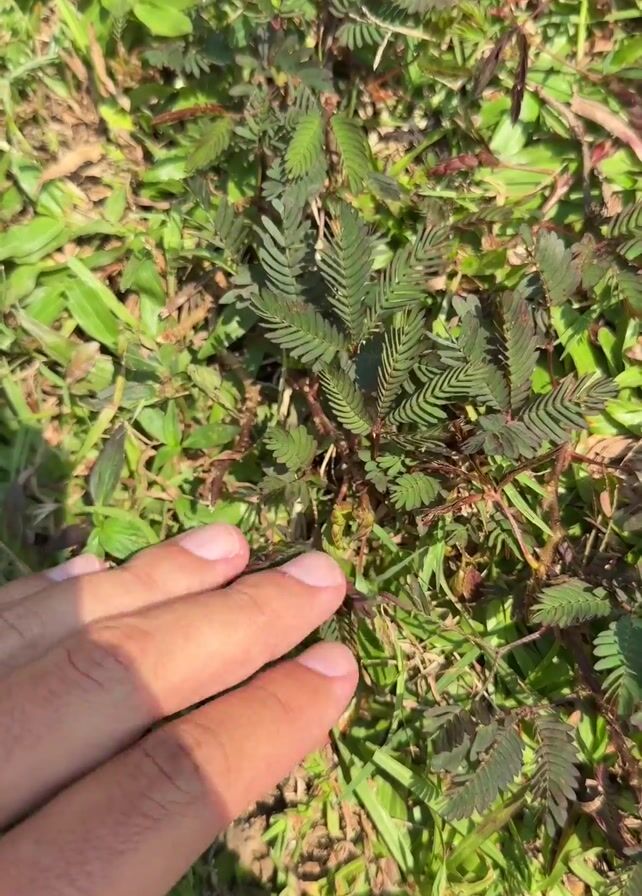 A close-up shot captures a small Mimosa pudica plant nestled in a bed of grass and dirt. The plant has delicate, fern-like leaves with a green and reddish-brown coloration. A hand approaches the plant, and the person touches its leaves. The leaves immediately curl inward in response to the touch. The surrounding grass is a mix of green and brown, indicating dry patches. Sunlight casts shadows across the scene.