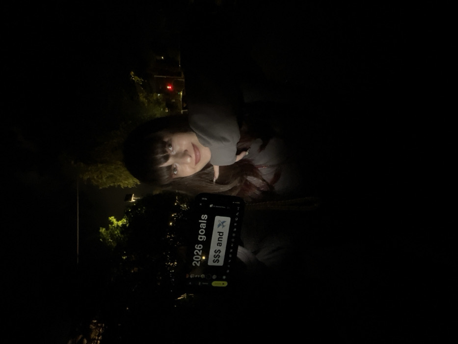 A woman with dark hair and bangs poses in low light. She holds a phone displaying "2026 goals, $$$ and ✈️." The background appears to be outdoors with trees and distant lights, possibly a street or traffic signal. She seems to be taking a selfie or having someone capture her picture at night.