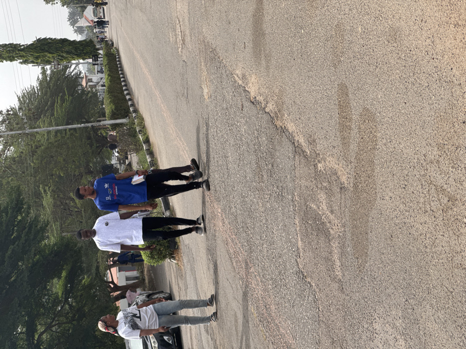 The scene depicts a daylight view of an asphalt road within a campus setting in Ipetumodu, Nigeria