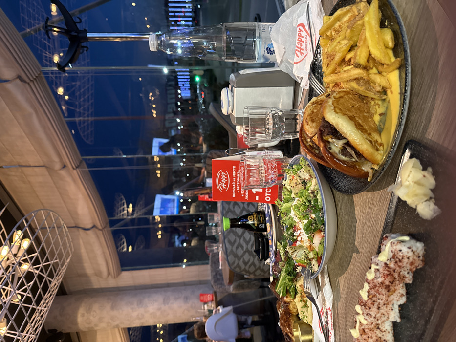 This image depicts the interior of a "Happy Bar & Grill" restaurant in Plovdiv, Bulgaria, at dusk or night. The foreground displays a wooden table laden with various food items and beverages, suggesting a multi-course meal. Prominently featured are: a black plate with a large, cheesy sandwich-like burger accompanied by a generous portion of golden french fries; a white bowl containing a fresh green salad with strawberries, cheese, and quinoa; a black rectangular plate presenting several sushi rolls garnished with red flakes and a white drizzle, alongside a small heap of pickled ginger; and another plate holding a baked pastry or savory dish with a side of greens. Beverages include two clear glasses of water, one containing ice, and a 1-liter plastic bottle of mineral water. A red "Happy" branded promotional stand with Cyrillic text offering a "10% discount" is visible, along with a bottle of Kikkoman soy sauce, a white paper bag labeled "Happy Доставка" (Happy Delivery), and a white and grey napkin dispenser. The restaurant's environment is modern, characterized by large, floor-to-ceiling glass windows that showcase blurred reflections of the interior and distant city lights, indicating an urban setting. Partially drawn light-colored blinds are visible on the upper sections of the windows. The ceiling features industrial-style white grid light fixtures. In the background, other patrons are visible as blurred figures seated at tables, one distinctly in a light-colored high-backed chair to the left. Concrete pillars are part of the structural design. The overall lighting is bright within the restaurant, contrasting with the dark blue exterior.