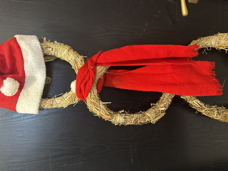 A vertically oriented, three-tiered decoration made of light-brown straw rings is displayed against a dark, possibly wooden, door in Petrovac na Moru, Montenegro. The topmost, smallest straw ring is surmounted by a red Santa hat featuring a white fluffy brim and a white pom-pom on its apex. A bright red fabric scarf, tied in a knot, is wrapped around the junction of the top and middle straw rings, with its frayed ends hanging vertically downwards. The straw rings are bound together, and some sections exhibit wrapping with a thin, gold-colored ribbon. A brass-toned door handle is partially visible on the far right edge of the dark door.