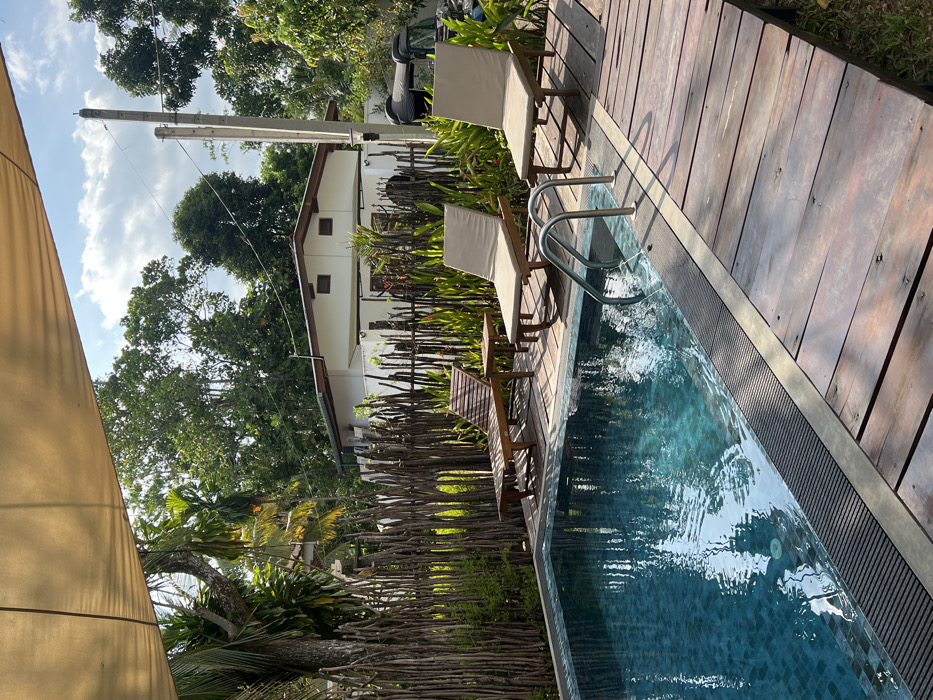 This image depicts an outdoor swimming pool area in Kabalana, Sri Lanka, under a partly cloudy sky