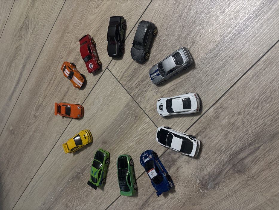 - "The scene depicts a static, overhead view of sixteen die-cast toy cars arranged on a light brown wooden floor" by FM-xVTPJ2, licensed under CC BY 4.0